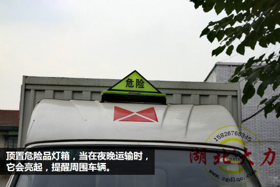 車頂導(dǎo)流罩上也加裝了危險運(yùn)輸車的燈箱表示,以提醒周圍車輛,該車輛運(yùn)輸?shù)奈;锲罚⌒谋茏尅?/span>