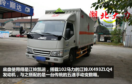 這里易燃液體廂式運(yùn)輸車的底盤采用的是江鈴凱運(yùn),搭載的是2.8排量的江鈴JX493ZLQ4發(fā)動機(jī),最大扭矩輸出245牛米,最大輸出102馬力。與之搭配的是一款傳統(tǒng)的五速手動變數(shù)箱,由于運(yùn)載的是危險物品,運(yùn)行速度也不會很快,那么這樣的動力配比是完全能滿足用戶需求的。