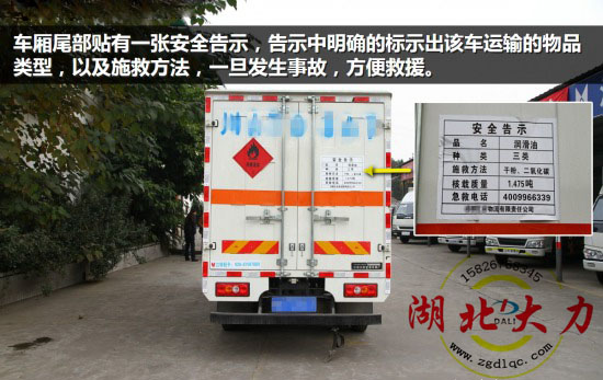 車廂尾部門板位置還貼有一張安全告示,告示中明確的標(biāo)示出該車運(yùn)輸?shù)奈锲奉愋停约笆┚确椒,如果車輛發(fā)生事故,這張告示將直接有效的告訴救援人員施救方法。