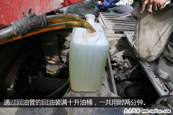通過回油管取油的速度取決于回油量,所以借著這次機會正好還能對回油量進行一次測試,一舉兩得。經過測試,從啟動發(fā)動機到把十升的油桶灌滿,一共用時兩分零五秒,可見電控共軌發(fā)動機的柴油循環(huán)流量非常的大。