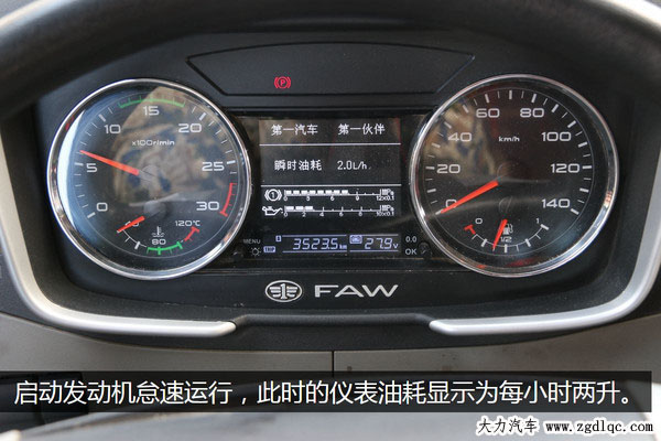 黃師傅的這臺解放J6裝配的是錫柴6DM2電控發(fā)動機,11升排量420馬力,駕駛室內的儀表能顯示出發(fā)動機的瞬時油耗,啟動發(fā)動機后發(fā)動機轉速穩(wěn)定在650轉左右,油耗顯示為每小時2升,但是電子儀表都有一些誤差,最終的數據還要看我們的實驗結果。