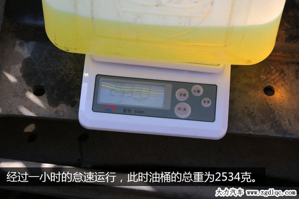 經過稱重,此時的油桶總重為2534克,相比測試前減少了1624克,這一部分就是怠速一小時消耗的燃油量,但這只是重量數據,要想得到體積數據還需要進行一次計算。已知柴油的密度為0.85,通過密度計算,此次怠速油耗測試一共消耗了1.91升柴油。