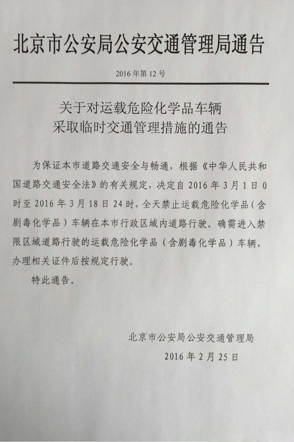 為確!皟蓵逼陂g交通秩序正常穩(wěn)定,保證城市道路交通安全與暢通,北京市決定于2016年3月1日0時至2016年3月18日24時,全天禁止運載危險化學品(含劇毒化學品)車輛資本是行政區(qū)域內(nèi)道路行駛,確需進入禁限區(qū)域道路行駛的運載危險化學品(含劇毒化學品)車輛,辦理相關證件后按規(guī)定行駛。