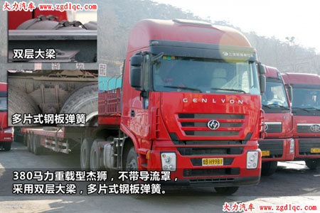 此次采訪的高師傅已經(jīng)擁有5輛杰獅了,配置均為380馬力發(fā)動機,法士特12檔超速檔變速箱,4.11速比后橋。高師傅第一次購買是在09年12月份,當時買的是一輛重載型藍色杰獅,2010年8月份買了一輛重載型紅色杰獅,用來拉17.5米平板車,在2010年11月份,又買了3輛杰獅輕量化車型。
