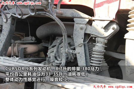 發(fā)動機采用CORSOR 9發(fā)動機,8.7升的排量達到380馬力,整體動力性感覺還行,一般百公里油耗在33-35L左右,這點高師傅也比較滿意。不過在爬坡時感覺性能一般,這主要是由于發(fā)動機的排量偏小,相對儲備功率不足,因此這款發(fā)動機其實更適合平路總重50噸級別的車輛在車速85左右行駛,據(jù)了解,上汽也正在準備引入更大排量的10升或者13升的發(fā)動機。
