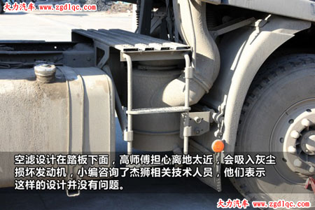杰獅的使用情況高師傅可以說是比較滿意,不過他也跟小編說了一下他的擔憂,杰獅的空濾設計在踏板下面,離地比較近,高師傅擔心會吸入灰塵損壞發(fā)動機,小編咨詢了一下杰獅相關技術(shù)人員,他們表示,杰獅這樣的布置方式是沿用了依維柯Stralis的形式,在密封性上已經(jīng)做了相關的適應性實驗,他們會考慮用戶的建議,做進一步的驗證,以保證車輛使用的穩(wěn)定性。