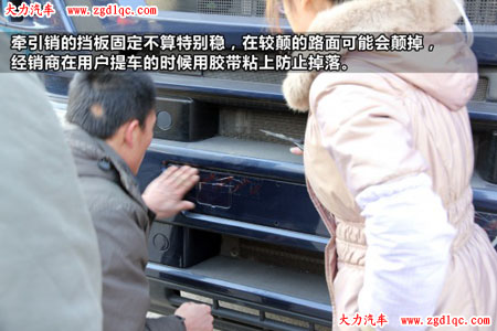 在駕駛室前面的小擋板固定不算穩(wěn),在較顛的路面可能會顛掉,經(jīng)銷商在用戶提車的時候用膠帶粘上防止掉落。