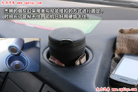 很多卡車司機都有吸煙的習慣,杰獅的煙灰缸采用類似尼龍搭扣的方式進行固定,在顛簸路面行駛時間長了會粘不住,司機只好用硬紙卡住。