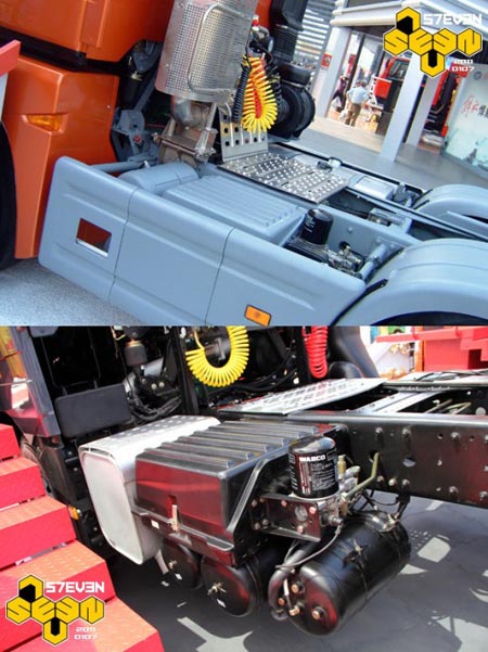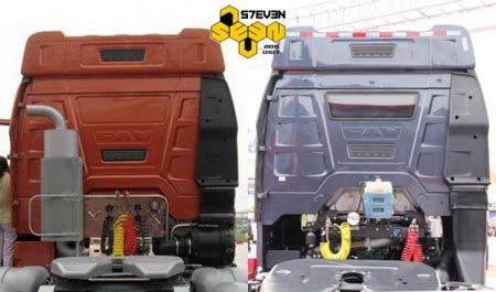從后面看,J6HC的空濾雖然沒有布置在底盤里或者駕駛室下方,但總體結(jié)構(gòu)比較緊湊。但是J6H不但駕駛室打了補(bǔ)丁,進(jìn)氣管也打了補(bǔ)丁,硬生生的加長了一截,看起來很怪異。另外膨脹水箱也沒有收納起來,而是外露在駕駛室后圍上,讓人感覺十分遺憾。