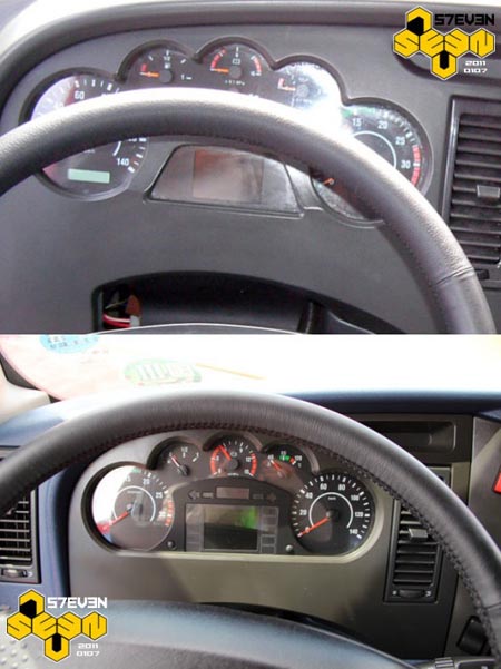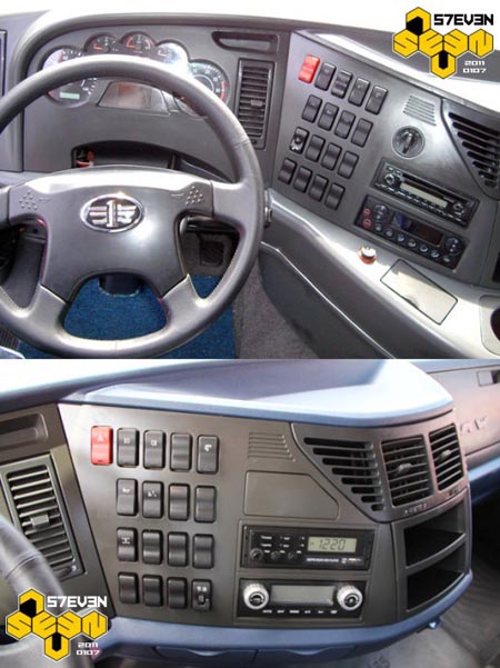 J6HC當(dāng)年的儀表臺是樣件,甚至沒有開皮紋。J6H采用與J6P一樣的儀表臺,雖然套色的結(jié)構(gòu)拜托了中國重卡惡俗的仿桃木習(xí)慣,但藍(lán)灰的顏色搭配可能并不是最好的選擇吧。