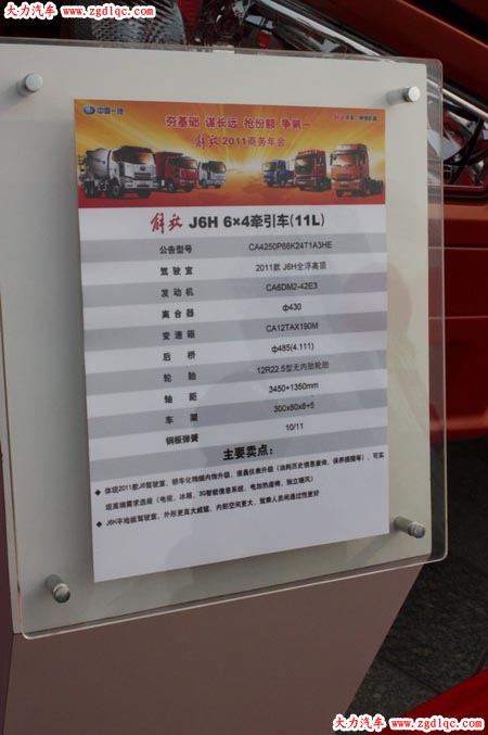 在2011年商務(wù)年會上,解放展示了作為即將在2011年量產(chǎn)的平地板J6,配置與2010年北京車展上的J6P平地板牽引車相同。而這次的命名,既不是“J6升級版”,也不是“J6P平地板”,而是回歸了他本來的名字“J6H”!