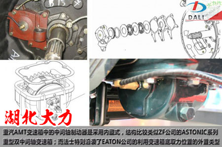 熟悉雙中間軸變速箱結(jié)構(gòu)的朋友們肯定知道,在主箱采用全嚙合套設(shè)計(jì)的變速箱中,一般在起步階段是需要有一個(gè)中間軸制動(dòng)器來(lái)讓中間軸快速的停止轉(zhuǎn)動(dòng),來(lái)實(shí)現(xiàn)主箱無(wú)噪音換檔,作為AMT變速箱,自然為了保證高可靠性和效率,一樣帶有TB(中間軸制動(dòng)器),不同的是,重汽采用類(lèi)似德國(guó)ZF公司的ASTRONIC變速箱的內(nèi)藏式類(lèi)型,而法士特采用了類(lèi)似EATON公司的外置式類(lèi)型,如果說(shuō)不出現(xiàn)意外問(wèn)題的情況下,相對(duì)而言重汽的結(jié)構(gòu)更小巧,整車(chē)通過(guò)性能也不會(huì)因此受到影響,但是一旦TB出現(xiàn)濕式多片式離合器打滑的現(xiàn)象,在更換上就沒(méi)有法士特這種外置類(lèi)型方便。