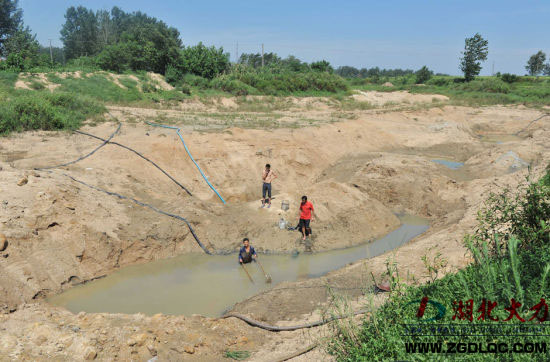 朱光城與三戶村民“組團(tuán)”請(qǐng)來(lái)一臺(tái)挖掘機(jī),挖了一個(gè)屬于他們的沙坑井?吹揭褲B了大半坑的水,朱光城眼睛一亮:“這些水可以灌一到兩畝田了!