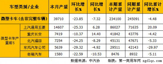 6月份微型卡車(含非完整車輛)銷量前5的企業(yè)依次為:上汽通用五菱(16259輛)、重慶長安(6895輛)、北汽福田(6466輛)、東風(fēng)汽車公司(5880輛)和奇瑞汽車(1178輛),5家合計銷售36678輛,占微型卡車(含非完整車輛)總銷量38919輛的94.24%。