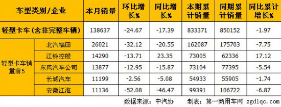 6月份輕型卡車(含非完整車輛)銷量前5的企業(yè)依次為:北汽福田(15841輛)、東風(fēng)汽車公司(14365輛)、安徽江淮(13853輛)、江鈴控股(11938輛)和長城汽車(10188輛),5家合計銷售66185輛,占輕型卡車(含非完整車輛)總銷量109764輛的60.30%。