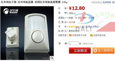 購買的方法其實(shí)很簡單,大家可以在淘寶搜索關(guān)鍵詞家用紅外線報警器,在結(jié)果中選擇最便宜的就行了,因?yàn)橘F的哪些有好多功能也是用不上的。有的網(wǎng)友不喜歡或者網(wǎng)購不方便的話,也可以在當(dāng)?shù)氐姆辣I報警器材店購買,一般都有。