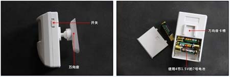 打開外包裝,紅外報警器的外觀簡潔明了,正面為感應(yīng)區(qū)與喇叭,側(cè)面是開關(guān),后部是萬向座與電池倉。