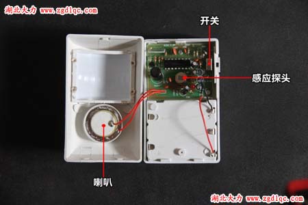 拆開紅外線報警器,內(nèi)部結(jié)構(gòu)主要分為兩部分:喇叭與電路板。喇叭就不說了,電路板上主要有感應(yīng)探頭與開關(guān)兩大元件。