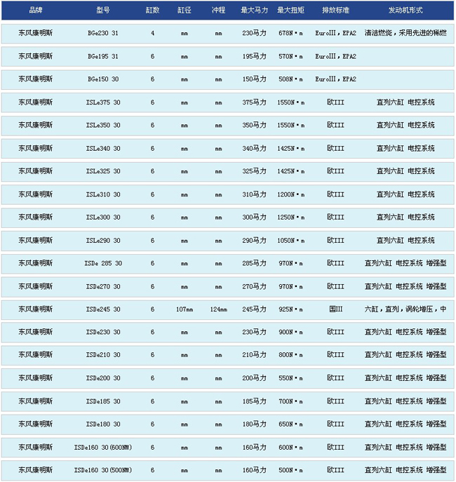 東風康明斯發(fā)動機有限公司主要生產(chǎn)康明斯B、C、D/L系列機械式和ISDe、ISLe、ISZ系列全電控柴油機,B系列天然氣發(fā)動機,D系列船用發(fā)電機,發(fā)動機排量為3.9L、4.5L、5.9L、6.7L 、8.3L、8.9L、13L,功率覆蓋范圍為125-545HP。